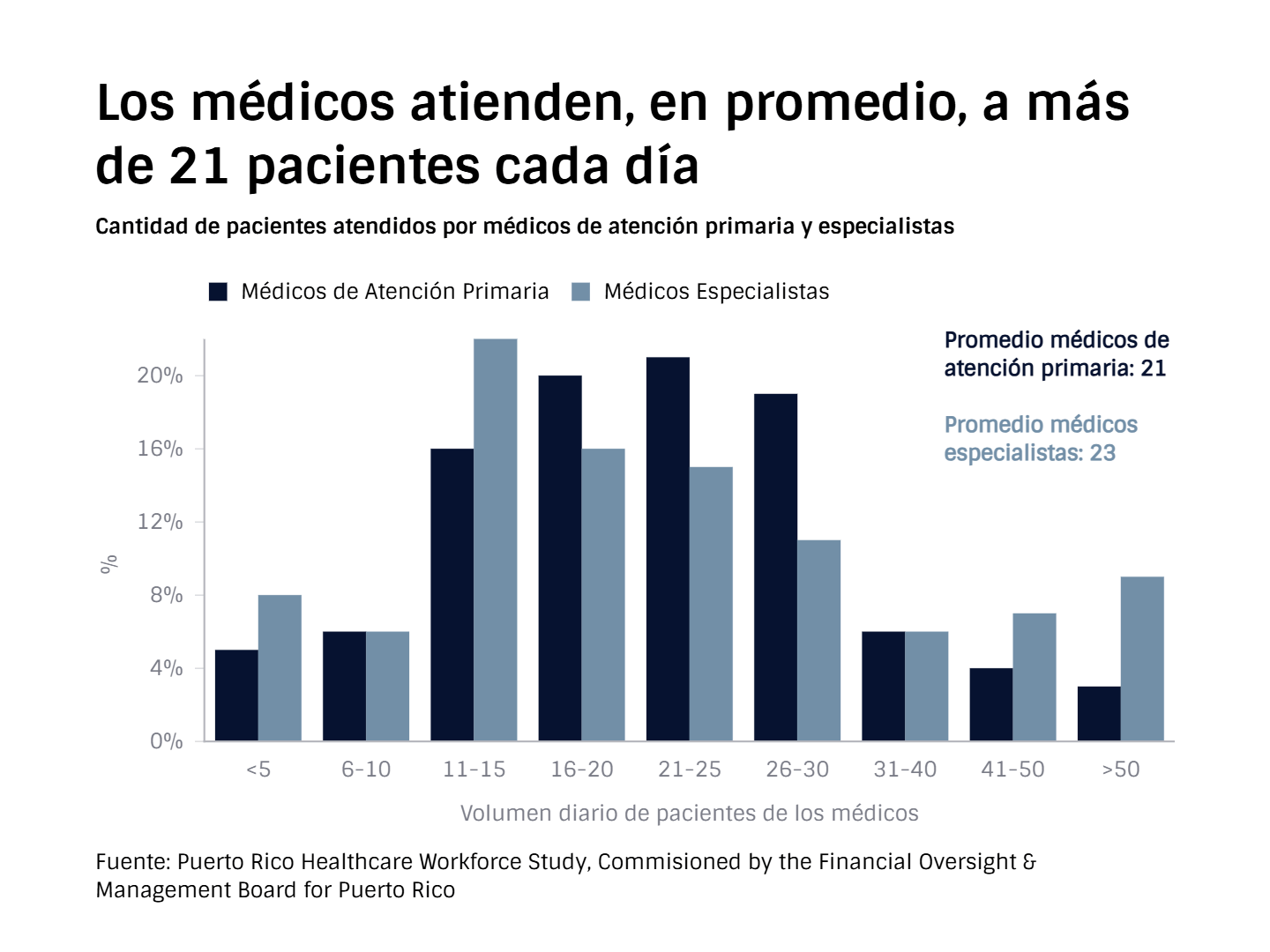 Estas cifras superan los promedios de Estados Unidos continental, donde los especialistas típicamente ven alrededor de 20.2 pacientes y los médicos de atención primaria unos 19.7 pacientes diarios. Este mayor volumen ocurre a pesar de la significativa escasez de personal sanitario en Puerto Rico.